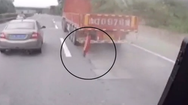 Video: Thanh sắt bay khỏi xe đầu kéo, đâm thủng kính xe buýt